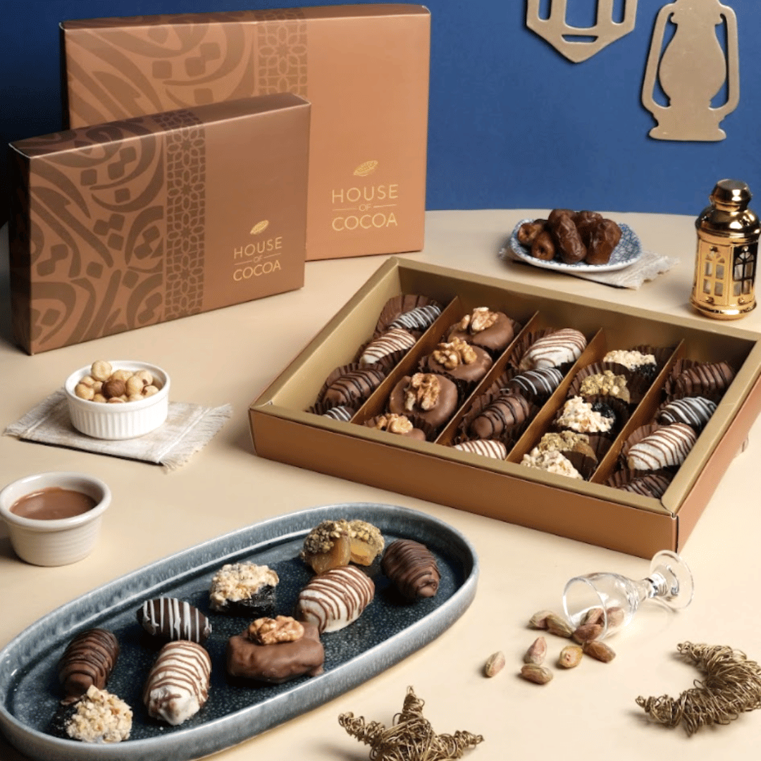 A beautiful delicious chocolate dates and Ramadan Delights box containing a delicious assortment.